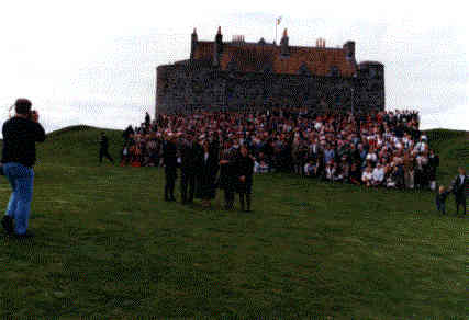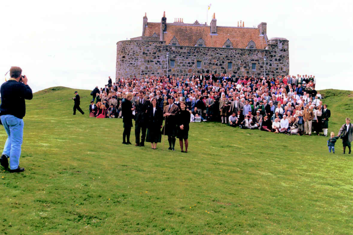 Official photographer grouping the Chief's family, and 500 more MacLeans, in front of Duart Castle.
